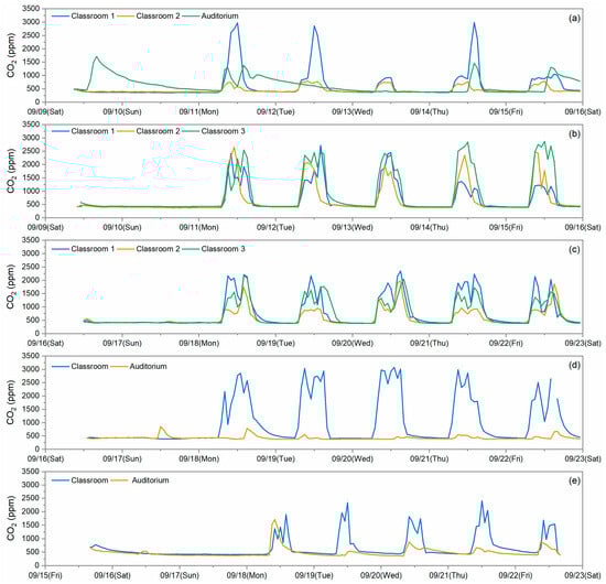 Temporal variation in CO2 concentrations measured at the indoor sites of (a) S1, (b) S2, (c) S3, (d) S4, and (e) S5.