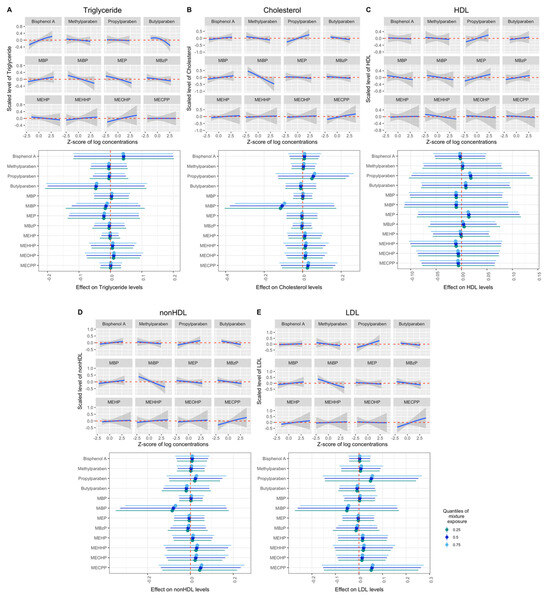 Bayesian Kernel Machine Regression (BKMR) mixture associations of phenol and phthalate metabolites and lipid biomarkers. (A–E) Mixture associations with total triglycerides, total cholesterol, HDL, non-HDL and LDL cholesterol in BKMR. Upper half: exposure–response relationships for each biomarker while holding all other biomarkers at their medians. Lower half: mean difference between the 75th and 25th percentiles of exposure (estimates and 95% credible intervals) when other biomarker concentrations were fixed at the 25th, 50th, and 75th percentiles. BKMR models were adjusted for age, education level, race, infertility diagnosis, mode of conception, number of fetuses, trimester and specific gravity. HDL: high-density lipoprotein. LDL: low-density lipoprotein. MEHP: mono(2-ethylhexyl) phthalate. MEHHP: mono(2-ethyl-5-hydroxyhexyl) phthalate. MEOHP: mono(2-ethyl-5-oxohexyl) phthalate. MECPP: mono(2-ethyl-5-carboxypentyl). MBP: mono-n-butyl phthalate. MiBP: mono-isobutyl phthalate. MEP: monoethyl phthalate. MBzP: monobenzyl phthalate.