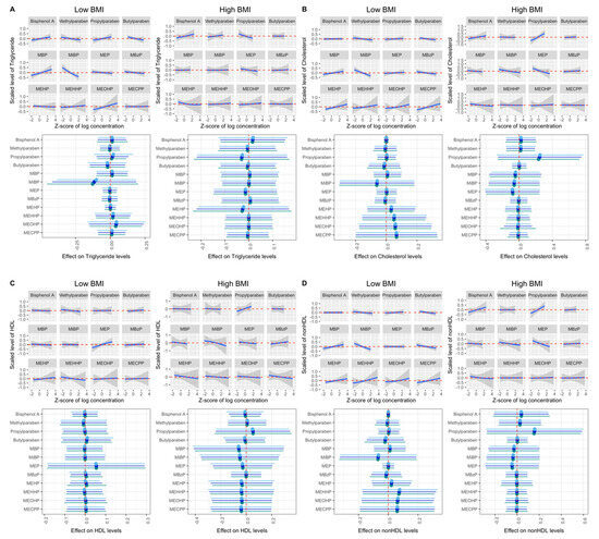 Bayesian Kernel Machine Regression (BKMR) mixture associations of phenol and phthalate metabolites and lipid biomarkers when stratified by BMI. (A–E) Mixture associations with total triglycerides, total cholesterol, HDL, non-HDL and LDL cholesterol in BKMR. Upper half: exposure–response relationships for each biomarker while holding all other biomarkers at their median. Lower half: mean difference between the 75th and 25th percentile of exposure (estimates and 95% credible intervals) when other biomarker concentrations were fixed at the 25th, 50th, and 75th percentiles. BKMR models were adjusted for age, education level, race, infertility diagnosis, mode of conception, number of fetuses, trimester and specific gravity. HDL: high-density lipoprotein. LDL: low-density lipoprotein. MEHP: mono(2-ethylhexyl) phthalate. MEHHP: mono(2-ethyl-5-hydroxyhexyl) phthalate. MEOHP: mono(2-ethyl-5-oxohexyl) phthalate. MECPP: mono(2-ethyl-5-carboxypentyl). MBP: mono-n-butyl phthalate. MiBP: mono-isobutyl phthalate. MEP: monoethyl phthalate. MBzP: monobenzyl phthalate.