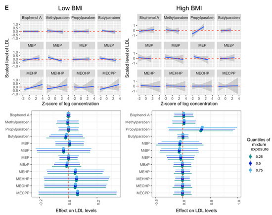 Exposure to parabens might result in elevated circulating lipid levels by activating the peroxisome proliferator-activated receptor (PPAR)-γ [30], which is presented mainly in adipose tissue and key regulators in the lipid metabolism [31,51]. In addition, parabens were found in adipose tissue [52]. Thus, women with overweight and obesity might be more sensitive to paraben exposure than others. Particularly, urinary propylparaben showed a suggestive positive relationship with total cholesterol and LDL among women with high BMI, and was the main contributor. Women in our study had higher concentrations of parabens compared to the Wuhan cohort, and higher concentrations of propylparaben compared to adult females participating in NHANES, while they had similar concentrations of other parabens [6]. This fact may explain why we observed a stronger relationship with propylparaben in single-pollutant analyses in BKMR, but not with the other parabens among women with higher BMI. However, additional studies on both animal models and humans are required to further understand the relationship between BMI, parabens and circulating lipid profile.