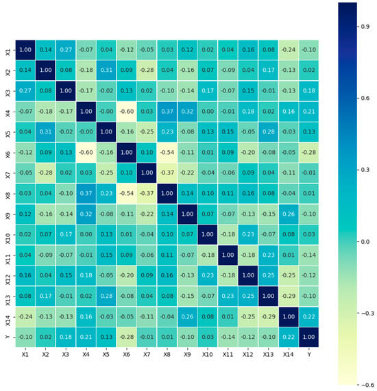 Pearson’s correlation matrix of influencing factors. (X1: experiment scale, X2: type of crops, X3: application rate (%), X4: feedstock, X5: pyrolysis temperature, X6: clay content, X7: silt content, X8: sand content, X9: soil pH, X10: soil organic carbon, X11: crop duration, X12: total heavy metals in soil, X13: available heavy metals in soil, X14: type of heavy metals, and Y: immobilization efficiency).