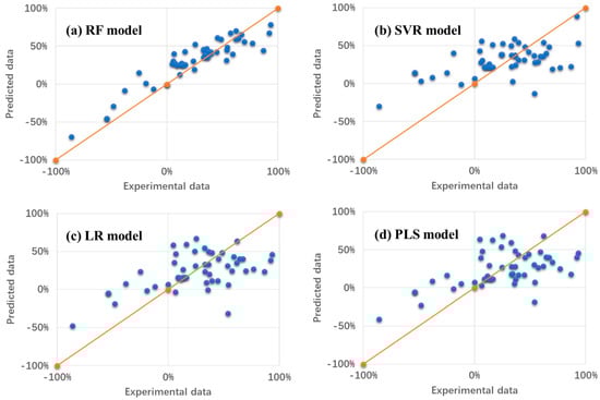 Analysis of the experimental and predicted data based on the model. (a) random forest (RF) model, (b) support vector regression (SVR) model, (c) linear regression (LR) model and (d) partial least squares (PLS) model. The red lines refer to the line y = x (45° line).