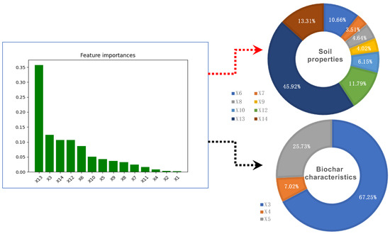 The results revealed that the RF model was the most accurate in predicting the HM immobilization efficiency of biochar, and the relative significance of each variable was also identified. The mean decrease impurity method was applied to calculate the relative significance of soil, biochar, and crop characteristics on the HM immobilization efficiency. The contribution of each influence variable factor in the model is shown in Figure 3.