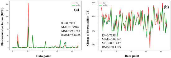 RF model for experimental and predicted values versus the number of data points: (a) bioaccumulation factors (BAFs) and (b) change in crop uptake (CCU); the red line represented true data, and the green line represented the predicted data.