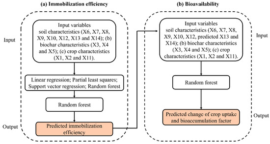 A two-stage approach to predict bioavailability (a) random forest model was used to predict the immobilization efficiency. (b) The predicted available HM concentrations are used as inputs for a developed random forest model to predict changes in crop uptake and bioaccumulation factors. (X1 is experiment size; X2 is type of crops; X3 is application rate (%); X4 is feedstock; X5 is pyrolysis temperature; X6 is clay content; X7 is silt content; X8 is sand content; X9 is soil pH; X10 is soil organic carbon; X11 is days from planting to sowing; X12 is total heavy metals in soil; X13 initial heavy metals in soils; X14 type of heavy metals).