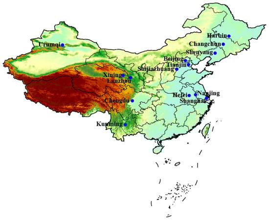 Air pollution data were retrieved from the Ministry of Ecology and Environment of the People’s Republic of China. PM2.5 and O3 are regularly monitored at 132 stationary monitoring stations (12 in Harbin, 10 in Changchun, 7 in Urumqi, 11 in Shenyang, 10 in Urumqi, 12 in Beijing, 15 in Tianjin, 8 in Shijiazhuang, 5 in Lanzhou, 9 in Nanjing, 10 in Shanghai, 8 in Hefei, 8 in Chengdu, and 7 in Kunming) at different points across the 14 cities. The 24 h average PM2.5 and daily maximum 8 h average O3 concentration levels, which were used as air pollutant metrics in this study, were calculated by averaging measurements from multiple fixed-site monitoring stations in each city. For detailed calculations of the PM2.5 as well as O3 concentrations, refer to our published articles [].