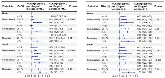 Meta-analysis results for the percentage changes (95% CI) in daily mortality linked to a 10 μg/m3 increase in PM2.5 and O3 concentrations in southern and northern China.