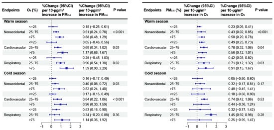 According to our stratified analysis by region (Figure 2), we obtained greater associations of PM2.5 with the three mortality categories when O3 is high in both southern and northern China (p < 0.05), although the association between PM2.5 and respiratory mortality in the north was not significant (p = 0.64). In southern China, increasing the exposure to PM2.5 enhanced the estimated associations of O3 with cardiovascular and respiratory mortality (p < 0.001 and p = 0.01, respectively). However, in northern China, interactions were observed only for cardiovascular mortality (p = 0.04). In terms of the seasonal stratification analysis (Figure 3), the associations between PM2.5 and the three mortality categories were greater (p < 0.05) at higher O3 levels during both the warm and cold seasons, except that the association between PM2.5 and respiratory mortality during the cold season was not statistically significant (p = 0.36). In addition, we found greater associations between O3 and nonaccidental and respiratory mortality (p < 0.001 and p = 0.03, respectively) when PM2.5 is high during the warm season. However, there were no significant associations between O3 and any mortality category under different PM2.5 strata during the cold season.