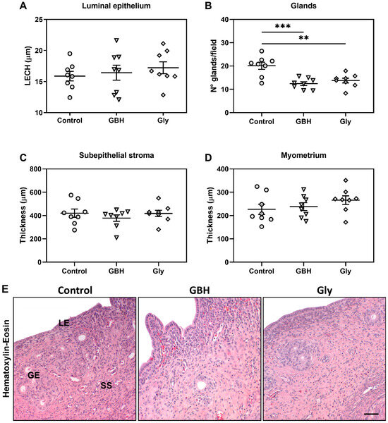 Effects of perinatal exposure to GBH or Gly on uterine morphology on GD5. (A) luminal epithelial cell height (LECH), (B) Number of endometrial glands per field, (C) thickness of the subepithelial stroma, and (D) thickness of the myometrium. Dots represent individual measures and solid lines represent the mean ± SEM of 8 animals per group. Asterisk denotes statistical significance (** p < 0.01, *** p < 0.001). (E) Representative photomicrographs of uterine sections stained with hematoxylin-eosin show reduced number of glands per field. LE: luminal epithelium; SS: subepithelial stroma; GE: glandular epithelium. Scale bar: 100 µm.