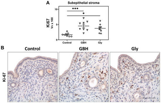 Both GBH- and Gly-exposed females showed an increase in cell proliferation in the subepithelial stroma compared to the control group (*** p < 0.001 vs. GBH, * p < 0.05 vs. Gly) (Figure 2A,B).