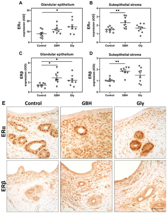 Effect of perinatal exposure to GBH or Gly on uterine expression of estrogen receptors (ERα and ERβ) on GD5. ERα quantification in (A) glandular epithelium and (B) subepithelial stroma. ERβ quantification in (C) glandular epithelium and (D) subepithelial stroma. The results of quantification are expressed as integrated optical density (IOD). Dots represent individual measures and solid lines represent the mean ± SEM of 8 animals per group. Asterisk denotes statistical significance (* p < 0.05; ** p < 0.01). (E) Representative photomicrographs of immunohistochemical detection of ERα and ERβ on uterine sections. Scale bar: 100 µm.