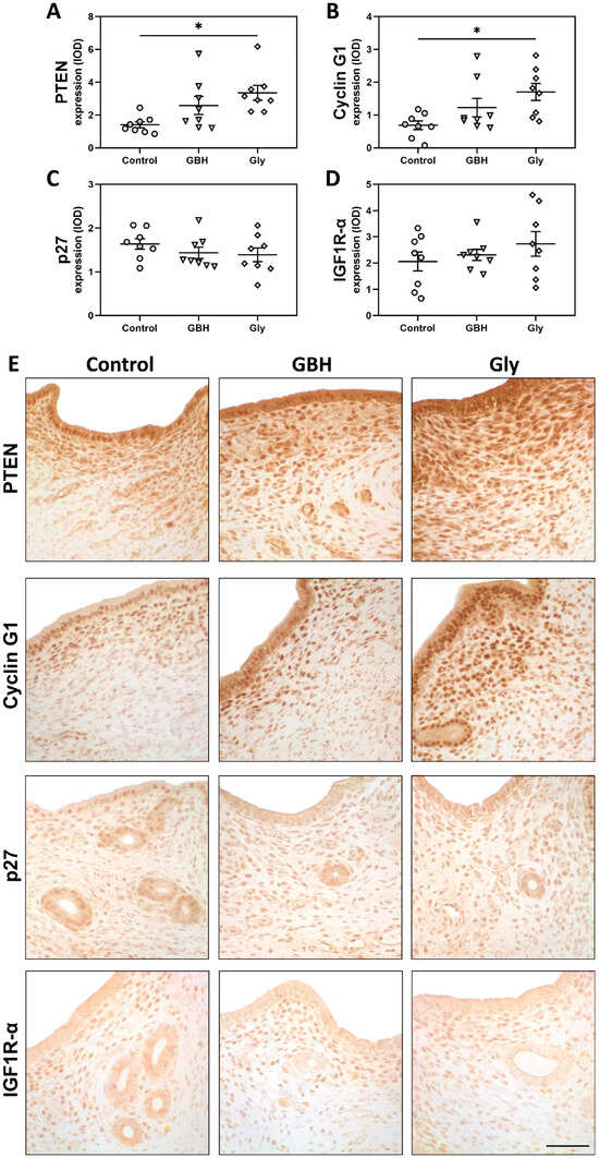 Effect of perinatal exposure to GBH or Gly on uterine expression of cell cycle regulators on GD5. Subepithelial stromal expression of (A) PTEN, (B) Cyclin G1, (C) p27, and (D) IGF1R-α. The results of quantification are expressed as integrated optical density (IOD). Dots represent individual measures and solid lines represent the mean ± SEM of 8 animals per group. Asterisk denotes statistical significance (* p < 0.05). (E) Representative photomicrographs of immunohistochemical detection of cell cycle regulators on uterine sections. Scale bar: 100 µm.