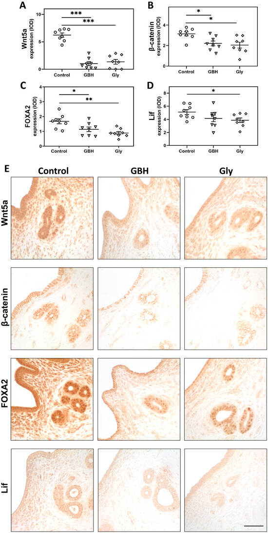 Both GBH and Gly decreased the protein expression of Wnt5a (*** p < 0.001), β-catenin (* p < 0.05), and FOXA2 (* p < 0.05 vs. GBH and ** p < 0.01 vs. Gly) in the uterine glandular epithelium compared to the control group (Figure 5A–C,E). Regarding Lif, a decreased expression was observed in the glandular epithelium of Gly-exposed animals (* p < 0.05) compared to the control group (Figure 5D,E). A similar trend was observed for the GBH group, but no significant differences were found (Figure 5D,E).