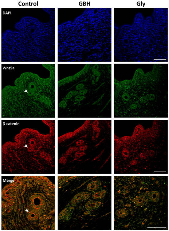 Representative photomicrographs of dual immunofluorescence staining for Wnt5a/β-catenin in the uterus of Control, GBH- and Gly-exposed rats on GD5. Images of DAPI nuclear staining (blue channel), Wnt5a (green channel), and β-catenin (red channel) makers were captured by confocal microscopy. The staining of each protein expression and its colocalization are indicated by white arrowheads. The original magnification was 40×, and the merge was 60×. Scale bar: 100 µm.