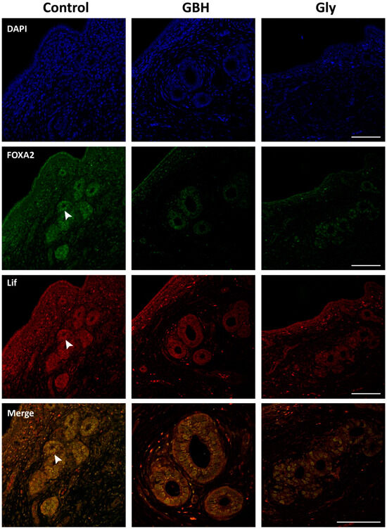 Representative photomicrographs of dual immunofluorescence staining for FOXA2/Lif in the uterus of Control, GBH-, and Gly-exposed rats on GD5. Images of DAPI nuclear staining (blue channel), FOXA2 (green channel), and Lif (red channel) markers were captured by confocal microscopy. The staining of each protein expression and its colocalization are indicated by white arrowheads. The original magnification was 40×, and the merge was 60×. Scale bar: 100 µm.