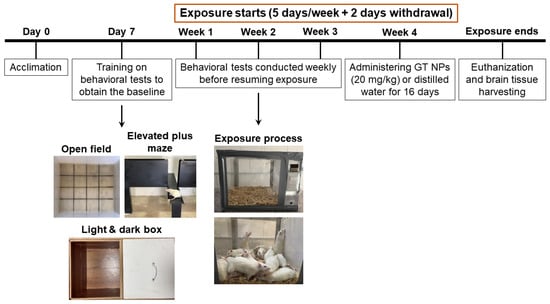 Timeline of the experiment involving tobacco smoke exposure, GT NP intervention, and behavioral testing.
