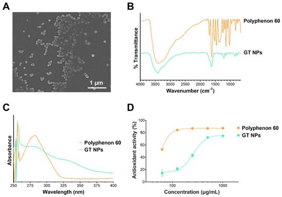 Characterization of GT NPs by (A) SEM, (B) FT-IR, (C) UV-vis, and (D) DPPH radical scavenging activity.