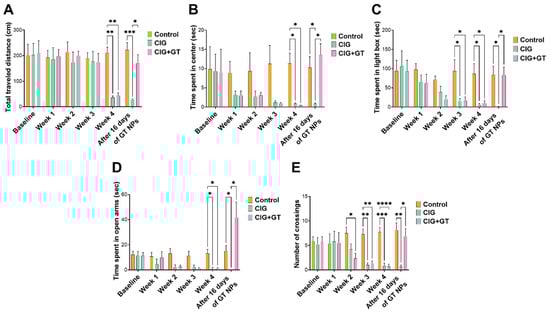 Results of the behavioral tests carried out on the animals before (baseline) and throughout tobacco smoke exposure. (A) Distance travelled in the open field (OF); (B) time spent in the center of the OF; (C) time spent in the illuminated compartment of the light and dark box (LDB); (D) time spent in the open arms of the elevated plus maze (EPM); (E) number of crossings of the EPM. Data presented as means ± SEM (n = 6); * p < 0.05, ** p < 0.01, *** p < 0.001, and **** p < 0.0001 based on two-way ANOVA followed by Bonferroni’s multiple-comparison test. Results show increased anxiety following 4 weeks of cigarette smoke exposure, and 16 days’ treatment with GT NPs attenuated this effect.