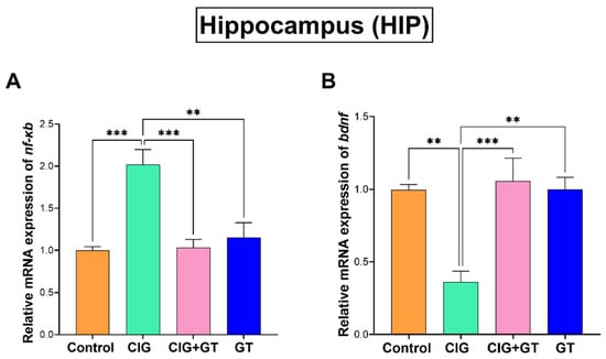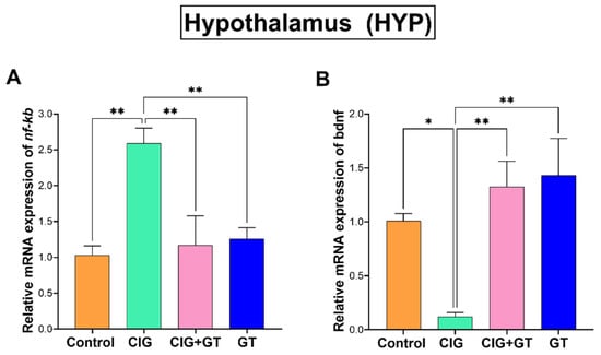 As depicted in Figure 5, a 36-day exposure to systemic tobacco smoke led to a significant elevation in the relative nf-κb mRNA expression and a significant reduction in relative bdnf mRNA expression in the HYP within the CIG group in comparison with the control, CIG+GT, and GT groups. This observed trend is supported by the results of one-way ANOVA, indicating a significant main effect of intervention on relative nf-κb mRNA expression (F(3, 16) = 8.341, p = 0.0014; Figure 5A) and a significant main effect of intervention on relative bdnf mRNA expression (F(3, 16) = 7.876, p = 0.0019; Figure 5B) in the HYP.