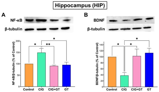 Protein expression of (A) NF-κB and (B) BDNF in the hippocampus (HIP) brain region after tobacco smoke exposure and intervention with GT NPs. Data expressed as means ± SEM (n = 5); * p < 0.05 and ** p < 0.01 based on one-way ANOVA followed by Tukey’s multiple-comparison test. Results show a significant increase in the protein expression of NF-κB and a significant decrease in BDNF protein expression following cigarette smoke exposure, which was attenuated by 16 days of treatment with GT NPs.