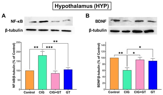 The protein expression analysis further verified the findings from the analysis of gene expression of nf-kb and bdnf in the HYP. As shown in Figure 7, a 36-day systemic exposure to tobacco smoke led to a significant elevation in NF-κB levels and a significant reduction in BDNF levels in the HYP within the CIG group, in comparison with the control, CIG+GT, and GT groups. This observed trend was verified by one-way ANOVA, indicating a significant main effect of intervention on NF-κB levels (F(3, 16) = 10.8, p = 0.0004; Figure 7A) and on BDNF levels (F(3, 16) = 6.739, p = 0.0038; Figure 7B) in the HYP.