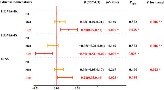 Moreover, the interaction curve demonstrated that serum SHBG markedly alleviated the glyphosate-related increase in the risk of HOMA-IR and FINS, while it increased the glyphosate-related increase in HOMA-IS (Supplementary Figure S4A–C). In addition, the restricted cubic plot showed linear and positive relationships of urinary glyphosate with HOMA-IR and FINS, and a linear and negative relationship with HOMA-IS was shown in individuals with low SHBG levels, but not in the high SHBG group (Supplementary Figure S4D–F). The combined effects of SHBG and glyphosate on HOMA-IR, HOMA-IS, and FINS are illustrated in Figure 1. Compared with the reference group (high-SHBG + low-glyphosate group), participants in the low-SHBG + high-glyphosate group had increased HOMA-IR (β = 0.30, 95%CI: 0.09 to 0.51, p = 0.007, PFDR = 0.038, P for trend = 0.006), decreased HOMA-IS (β = −0.30, 95%CI: −0.51 to −0.09, P = 0.007, PFDR = 0.038, P for trend =0.006) and increased FINS levels (β = 0.22, 95% CI: 0.03 to 0.40, p = 0.023, PFDR = 0.084, P for trend = 0.023). Most of the significant results in Figure 1 have a PFDR value < 0.05. As shown in Supplementary Table S5, no significant result of the mediation analysis was identified for SHBG on the association between glyphosate and glycemic outcomes, excluding the possibility that SHBG could act as mediating variable in the association between glyphosate and glycemic disorders.