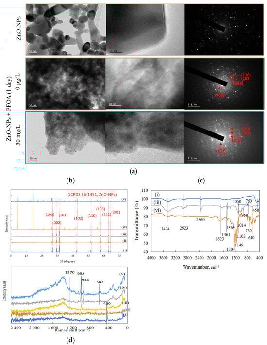 TEM, XRD, FTIR, and Raman analysis: Alterations in the morphology of ZnO-NPs were observed after 1 day of interaction with PFOA using TEM (