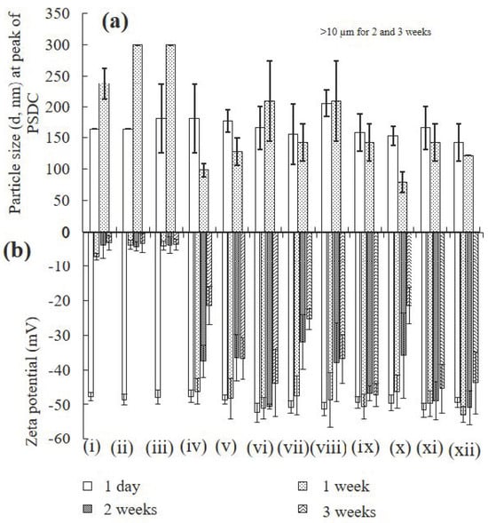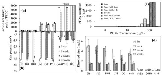 Figure 1a, the size at the peak of the PSDC of ZnO-NPs with 10 µg/L PFOA is 173 nm after 1 day and 298.5 nm after 1 week, with a surface charge of −45.4 mV after 1 day and −1.9 mV after 1 week. The size of ZnO-NPs was also increased affecting the surface charge of ZnO-NPs at the same concentration (