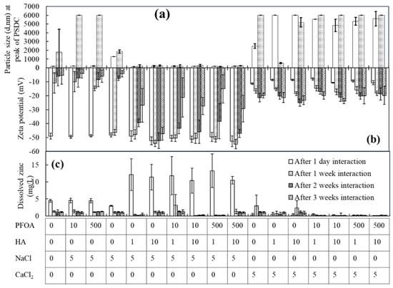 ) after 1 week due to the aggregation of nanoparticles, and only a few fragments were measured after 1 week of interaction. It is assumed that the particle size at the peak of the PSDC would be larger than 10,000 nm. In the presence of HA, initial dispersion was observed with increasing HA concentration in the presence of salts and PFOA; however, after a few weeks, the same behaviour of aggregation/agglomeration/sedimentation was observed, with the particle size being nonuniform and not measurable, while there was a decreasing zeta potential.