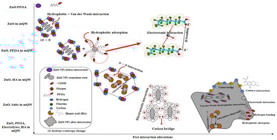 Figure 5) with a diminished surface charge, as described in the aforementioned sections. The addition of various concentrations of HA in the presence of PFOA did not significantly change the zeta potential compared to that of samples with HA. This confirms that interactions between HA molecules (the dispersion of HA-coated ZnO-NPs) are more dominant at high concentrations (such as 10 mg/L HA) than the electrostatic interactions between negatively charged nanoparticles surrounded by monovalent cations (Na
