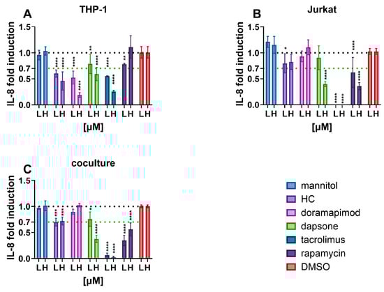 - Kimura, Y.; Fujimura, C.; Ito, Y.; Takahashi, T.; Terui, H.; Aiba, S. Profiling the Immunotoxicity of Chemicals Based on in Vitro Evaluation by a Combination of the Multi-ImmunoTox Assay and the IL-8 Luc Assay. Arch. Toxicol. 2018, 92, 2043–2054. [Google Scholar] [CrossRef]