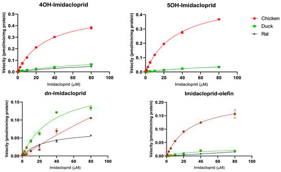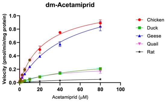 | Acetamiprid | dm-acetamiprid | Vmax | 1.2 ± 0.0 | 0.4 ± 0.0 | 1.3 ± 0.2 | 0.3 ± 0.1 | 0.1 ± 0.0 |