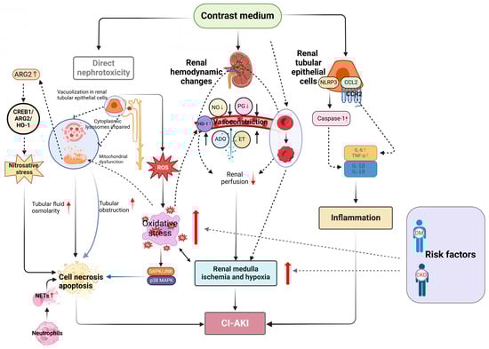 Numerous studies have linked oxidative stress to the development of CI-AKI [,,]. CM impact ATP synthesis by causing renal medulla ischemia and hypoxia, thereby disrupting medullary oxygen homeostasis. Specifically, hypoxic conditions reduce oxidative phosphorylation, leading to the production of large amounts of ROS. These ROS may directly damage cell membranes, proteins, and DNA, ultimately causing cell death or apoptosis. Notably, ROS-induced damage to mitochondrial DNA leads to mitochondrial dysfunction, which in turn increases ROS production, creating a positive feedback loop that intensifies oxidative stress. Renal tubular epithelial cells, with their high metabolic activity and mitochondria-rich composition, are particularly vulnerable to oxidative stress []. The accumulation of ROS in these cells might act as intracellular messengers, activating signaling pathways such as SAPK/JNK and p38 MAPK, which indirectly promote apoptosis [,]. Additionally, CM-induced elevated ROS levels may reduce the inhibition of Na/K-ATPase activity in the medullary thick limb, leading to its overactivation and further disrupting medullary oxygen homeostasis. This disruption of the Na/K-ATPase function not only affects the ionic balance of renal cells but also increases ATP consumption []. In the context of CI-AKI, this increased energy consumption may further damage renal cells already in a hypoxic state, exacerbating cellular dysfunction and death. Studies have indicated that elevated glucose concentrations may exacerbate CM-induced oxidative stress in mesangial cells. This observation suggests that diabetic patients could be at a higher risk of developing CI-AKI and underscores the significant role of predisposing risk factors in the pathogenesis of CI-AKI.