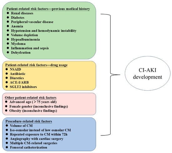 Contrast-induced acute kidney injury (CI-AKI) is manifested by an abrupt decline in kidney function as a consequence of intravascular exposure to contrast media. It is also a common complication after coronary angiography (CAG) and percutaneous coronary intervention (PCI) []. Kidney Disease: Improving Global Outcomes (KDIGO) group defines CI-AKI as an increase in serum creatinine value to more than 1.5 times the baseline creatinine value within 7 days of contrast exposure; or an increase in serum creatinine of ≥26.4 μmol/L (0.3 mg/dL) within 48 h; or a urinary output of <0.5 mL/kg/h within 6 h of CM exposure []. With the advancement of medical imaging and the extensive utilization of interventional diagnostic and therapeutic techniques, the clinical application of CM has become increasingly prevalent, leading to a significant increase in the incidence of CI-AKI []. It is important to note that not all AKIs that occur after contrast administration are caused by the CM themselves. Many other risk factors for AKI should also be considered, including hypotension, hypovolemia, inflammation, and sepsis. AKI that occurs after CM use due to these factors is referred to as contrast-associated acute kidney injury (CA-AKI). Failure to differentiate between these risk factors in the clinical setting may result in delayed or inappropriate treatment. In healthy individuals, the incidence of CI-AKI is below 1%, indicating that kidneys without significant risk factors generally withstand contrast exposure well. However, in individuals with pre-existing renal insufficiency or additional risk factors, such as diabetes, hypertension, advanced age, and cardiovascular disease, the incidence of CI-AKI can escalate to 15% []. Given the potential for kidney damage associated with the use of CM, particularly in patients with pre-existing severe renal disease, physicians exercise caution in their application. Nonetheless, in the context of life-threatening emergencies such as ST-segment elevation myocardial infarction (STEMI), the utilization of CM is essential for conducting detailed diagnostic assessments and enabling timely endovascular interventions. While CI-AKI often manifests as transient renal injury, some individuals may suffer from irreversible renal decompensation, need hemodialysis, or, in severe cases, face mortality []. Studies have indicated that the in-hospital mortality rate for patients with CI-AKI is between 21 and 22%, while for patients without CI-AKI, the rate is significantly lower, ranging from 0.9 to 1.4% [,]. These findings suggest that CI-AKI may not only have potential long-term effects on renal function but also significantly increase in-hospital mortality rates. Currently, the absence of universally endorsed preventive and therapeutic strategies for CI-AKI, aside from extracellular volume expansion with NaCl or NaHCO3, underscores the significance of identifying and managing pertinent risk factors to mitigate the development of CI-AKI []. Drawing upon the research foundation of CI-AKI’s pathophysiology, this review presents early integrated prevention strategies focusing on risk factors, risk assessment models, and sensitive biomarkers. It also reviews recent preventive and therapeutic strategies for CI-AKI, along with exploring potential future medications and methods, aiming to offer a novel outlook on the treatment of CI-AKI.