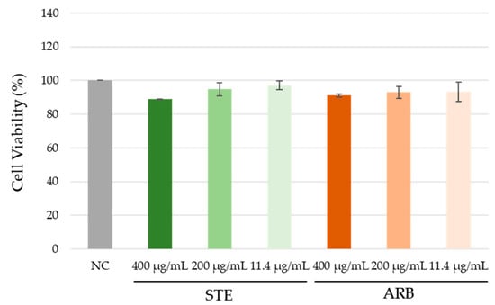 Effect of the aqueous extract of strawberry tree leaves (STE) and arbutin (ARB) on the viability of PK-15 cells after 24 h treatment in vitro. Cell samples were processed in triplicate. Viability was determined using the MTS assay, and the percentage of viability was expressed relative to the control (whose value was considered 100%). Values are expressed as mean ± standard deviation. NC—untreated control. Comparisons between the values obtained for cell viability were performed using ANOVA with Tukey’s HSD post hoc test. No difference was significant at p < 0.05.