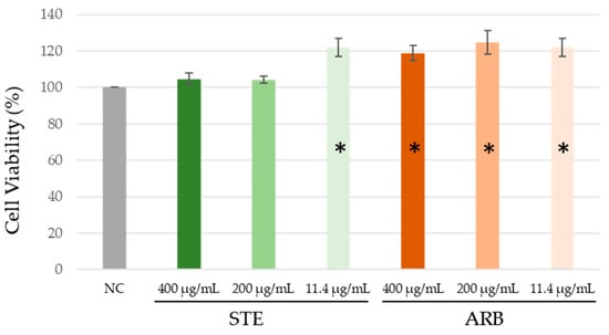 Effect of the aqueous extract of strawberry tree leaves (STE) and arbutin (ARB) on the viability of HepG2 cells after 24 h treatment in vitro. Cell samples were processed in triplicate. Viability was determined using the MTS assay, and the percentage of viability was expressed relative to the control (whose value was considered 100%). Values are expressed as mean ± standard deviation. NC—untreated control; * significantly increased compared to NC (ANOVA with Tukey’s HSD post hoc test; at p < 0.05).