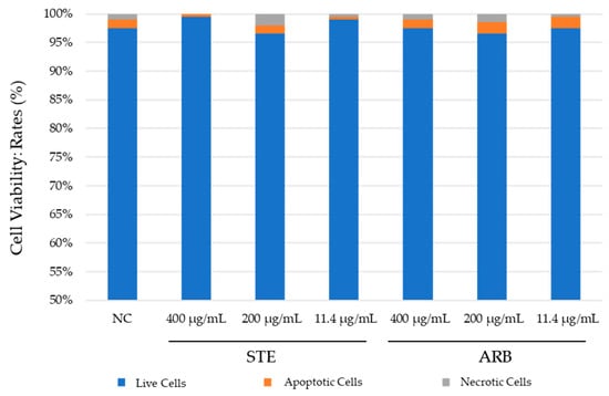 Figure 5 shows the results of the fluorescence viability assay with ethidium bromide and acridine orange for HepG2 cells. Both tested compounds showed a low cytotoxic potential. No association was found between the cytotoxic effect and the concentration of the tested substances. Exposure to the lowest concentration of STE (11 µg/mL) resulted in lower cell viability than in the negative control (Figure 5) (Pearson’s χ2 test; at p < 0.05). Most cell death was by apoptosis.