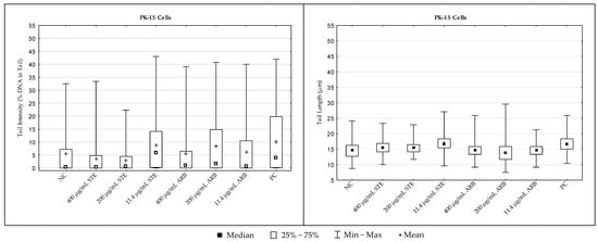 The results regarding the extent of DNA damage in PK-15 cells measured with the alkaline comet assay are shown in Figure 6. Detailed inter-group comparisons and their statistical significance (ANOVA with Tukey’s HSD post hoc test, at p < 0.05) are reported in Table 1. For comet descriptor tail intensity, the critical F value was 12.4379, while for the other descriptor (tail length), it was 38.1667.