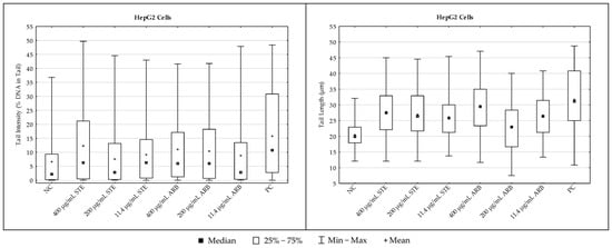The results regarding DNA damage levels in HepG2 cells, measured with the alkaline comet assay, are shown in Figure 7. Detailed inter-group comparisons and their statistical significance (ANOVA with Tukey’s HSD post hoc test, at p < 0.05) are reported in Table 2. For the comet descriptor tail intensity, the critical F value was 8.9588, while for tail length, it was 49.9409.