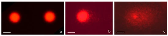Photomicrographs of nuclei observed under an epifluorescence microscope after the alkaline comet assay. (a) Non-damaged DNA of HepG2 cells; (b) HepG2 cells treated with 400 μg/mL of strawberry tree aqueous leaf extract (STE) in vitro for 24 h; (c) highly fragmented nucleus of HepG2 cell in the positive control (hydrogen peroxide, 100 µM) applied for 10 min. Stained with ethidium bromide. Magnification ×200; scale bar, 20 μm.