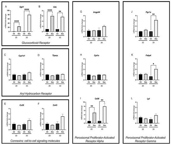 Dexamethasone exposure induced Sgk1 and Gilz mRNA expression in confluent and spheroid cultures (Figure 2A,B). While Gilz fold change remained similar between 2D confluent and 3D spheroid cultures (~6 mRNA fold change), Sgk1 had a significantly higher fold change in 3D culture conditions (two-way ANOVA p < 0.0001) compared to 2D confluent cultures. Similarly, while dexamethasone exposure induced the PPARα-transcriptionally regulated gene Cd36 in both culture conditions (Figure 2I), 3D spheroids had a significantly higher fold change (two-way ANOVA p = 0.003). Interestingly, while PPARγ-regulated genes Pgc1α, and Fabp4 were not significantly induced (p > 0.05) by dexamethasone exposure in 2D monolayers of McA cells, in 3D cultured spheroids, Pgc1α and Fabp4 mRNA expression was significantly increased (Figure 2J,K). Dexamethasone treatment did not alter the gene expression of any targets related to AhR activation (Figure 2C,D) or connexins (Figure 2E,F).