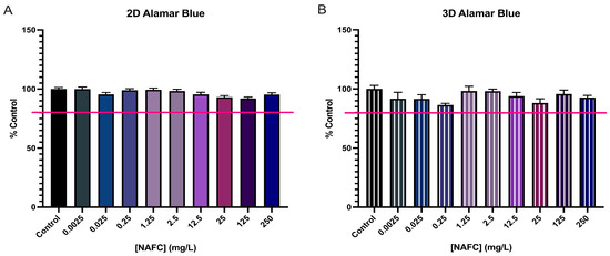 Figure 3. Cytotoxicity assay of 2D (A) and 3D (B) cultured McA-RH7777 cells following NAFC exposure [0.0025–250 mg/L] (n = 6) for 24 h. Viability of 80% is signified by the red line.