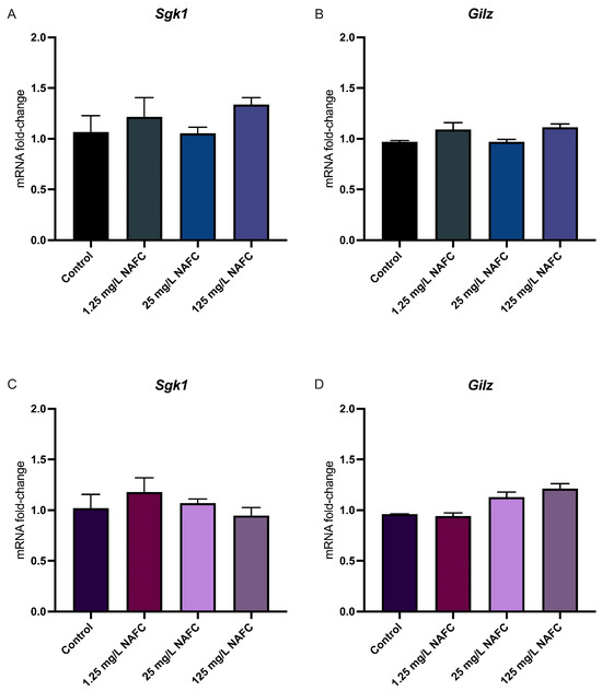 Figure 4. mRNA expression of genes involved in glucocorticoid signaling. Sgk1 (A,C) and Gilz (B,D) in 2D (top panel; (A,C)) and 3D (bottom panel; (B,D)) cultured McA-RH7777 cells following 24 h exposure to NAFCs [0, 1.25, 25, 125 mg/L] (n = 4–6). Values are shown as mean ± SEM.