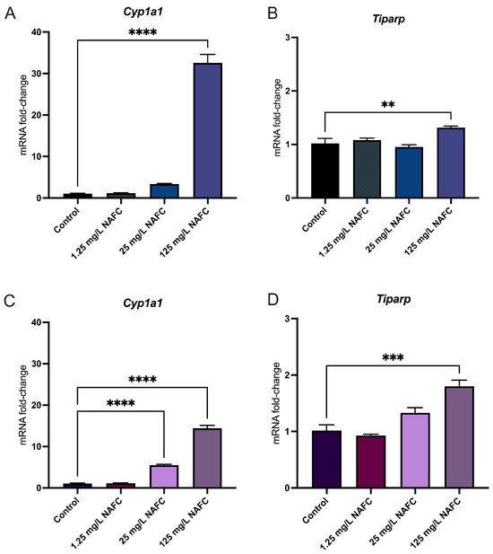 Figure 5. mRNA expression of genes involved in aryl-hydrocarbon receptor activation. Cyp1a1 (A,C) and Tiparp (B,D) in 2D (top panel; (A,B)) and 3D (bottom panel; (C,D)) cultured McA-RH7777 cells following 24 h exposure to NAFCs [0, 1.25, 25, 125 mg/L] (n = 4–6). Values are shown as mean ± SEM; asterisks **, ***, **** indicate significant differences (p < 0.01, 0.005, 0.001, respectively) versus control.