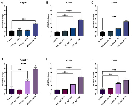 Figure 6. mRNA expression of genes involved in peroxisomal proliferator activating receptor alpha activation. Angptl4 (A,D), Cpt1a (B,E), and CD36 (C,F) in 2D (top panel; (AC)) and 3D (bottom panel; D, E, F) cultured McA-RH7777 cells following 24 h exposure to NAFCs [0, 1.25, 25, 125 mg/L] (n = 4–6). Values are shown as mean ± SEM; asterisks **, ***, **** indicate significant differences (p < 0.01, 0.005, 0.001, respectively) versus control.