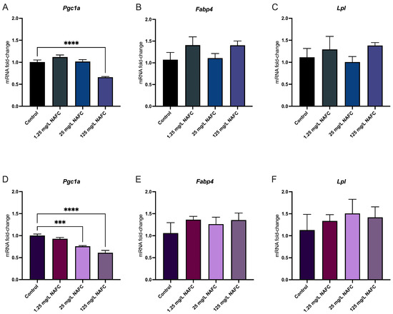 Figure 7. mRNA expression of genes involved in peroxisomal proliferator activating receptor gamma activation. Pgc1a (A,D), Fabp4 (B,E), and Lpl (C,F) in 2D (top panel; (AC)) and 3D (bottom panel; (DF)) cultured McA-RH7777 cells following 24 h exposure to NAFCs [0, 1.25, 25, 125 mg/L] (n = 4–6). Values are shown as mean ± SEM; asterisks ***, **** indicate significant differences (p < 0.005, 0.001, respectively) versus control.