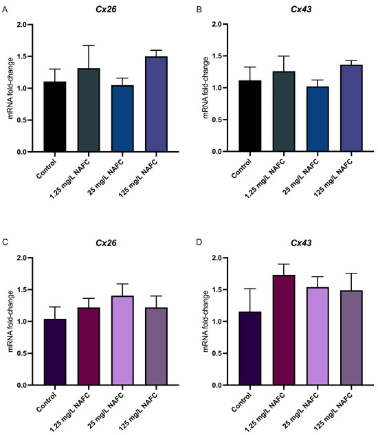 Figure 8. mRNA expression of connexin-genes. Cx26 (A,C) and Cx43 (B,D) in 2D (top panel) and 3D (bottom panel) cultured McA-RH7777 cells following 24 h exposure to NAFCs [0, 1.25, 25, 125 mg/L] (C, D, G, H) (n = 4–6). Values are shown as mean ± SEM, n = 6.