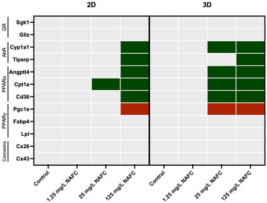 Figure 9. Summary heatmap of receptors: glucocorticoid receptor (GR), aryl hydrocarbon receptor (AhR), peroxisome proliferator-activated receptor alpha (PPARα), peroxisome proliferator-activated receptor gamma (PPARγ)—and connexins. mRNA fold changes in 2D and 3D cultures of McA-RH7777 following 24 h exposure to NAFCs [0, 1.25, 25, 125 mg/L] (n = 4–6). Significant inductions are marked in green, while significant decreases are marked in red.