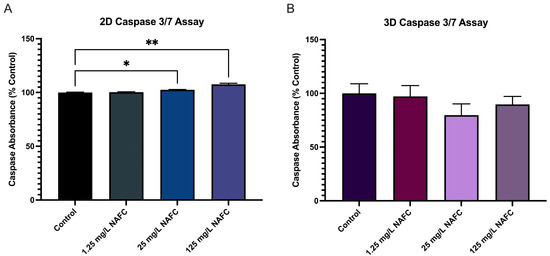 Figure 10. Caspase 3/7 activity in 2D (A) and 3D (B) McA-RH7777 cells following NAFC exposure [0, 1.25, 25, 125 mg/L] (n = 9) for 24 h. Values are shown as mean ± SEM; asterisks *, ** indicate significant differences (p < 0.05, 0.01, respectively) versus control.