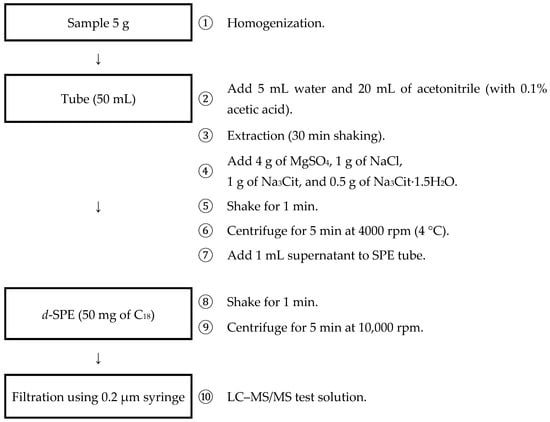 The optimized sample preparation procedure is detailed in Figure 2. Briefly, 5 g of the homogenized sample was added to a 50 mL Teflon tube, followed by 5 mL of water and 20 mL of acetonitrile containing 0.1 acetic acid. After shaking for 30 min, 4 g of MgSO4, 1 g of NaCl, 1 g of Na3Cit, and 1.5 g of Na3Cit·1.5H2O were added, and the mixture was shaken for an additional 30 min. The mixture was centrifuged at 4000 rpm for 5 min at 4 °C using a Megafuge 1.0 centrifuge (Thermo Fisher Scientific, Waltham, MA, USA). The acetonitrile and water layers were separated, and 1 mL of the supernatant (acetonitrile) was transferred to a dispersive solid-phase extraction (d-SPE) tube containing 50 mg of C18. After vortexing for 1 min and centrifugation at 10,000 rpm for 5 min, the supernatant was filtered through a 0.2 μm syringe filter to prepare the test solution for LC–MS/MS analysis.